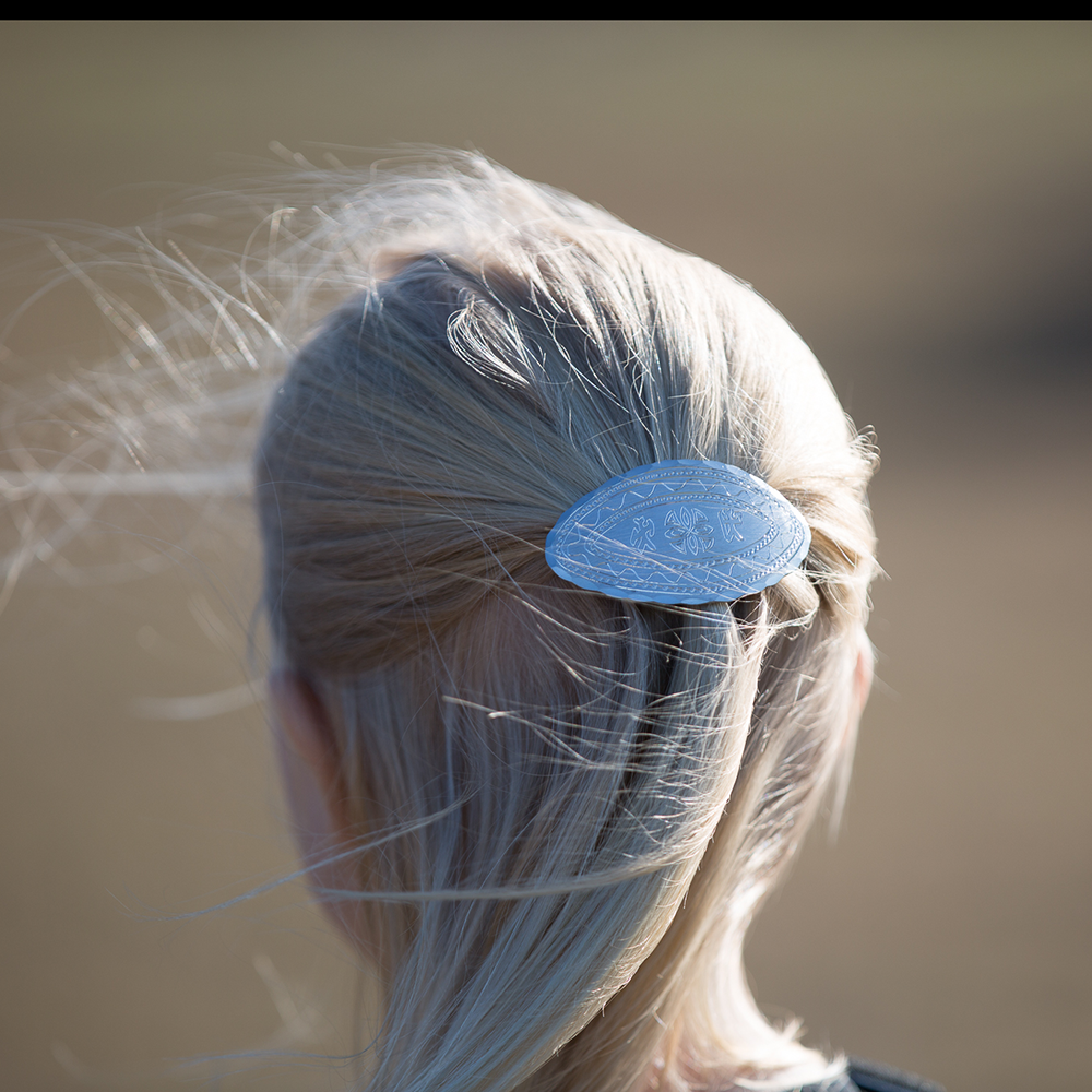 Hårspänne i tenn, med samiska tecken i gravyren.