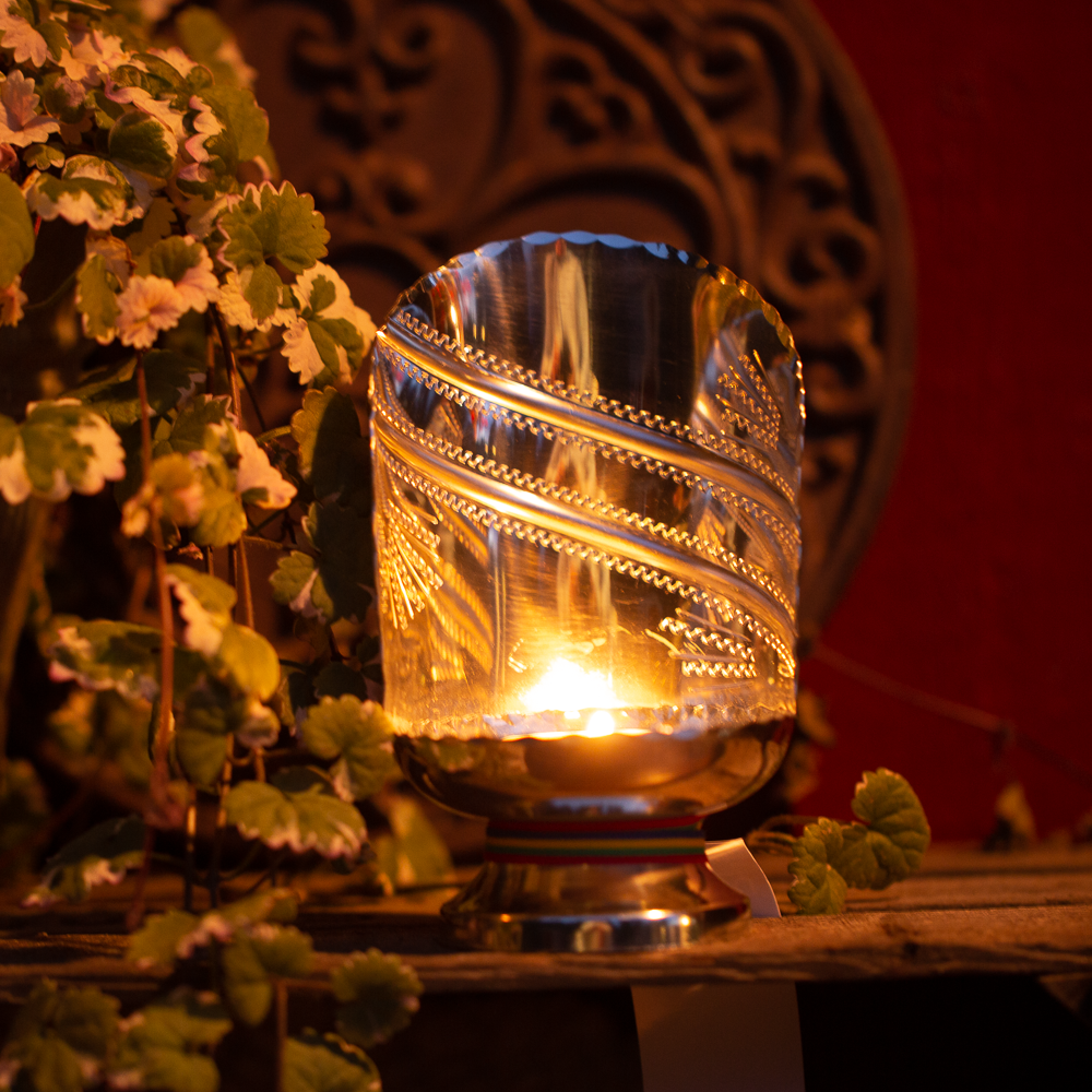 Handgjord ljuslykta i tenn med gravyr inspirerad av det mäktiga norrskenet. Lyktan ger en behaglig och stämningsfull belysning.